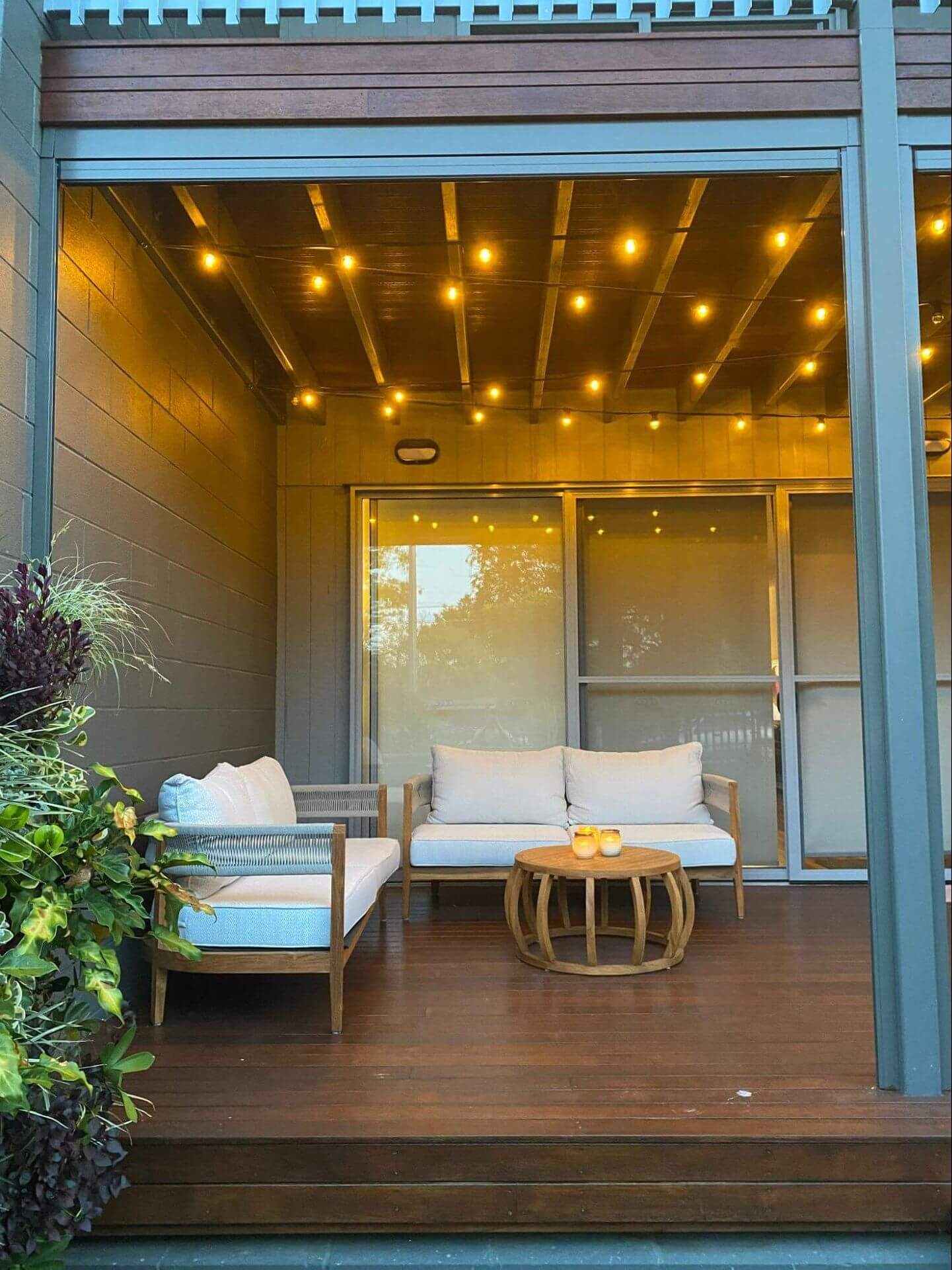 A simple yet effective solution was to install a new lighting circuit from the switchboard to a new switch location on the deck area to allow for some modern festoon lighting.